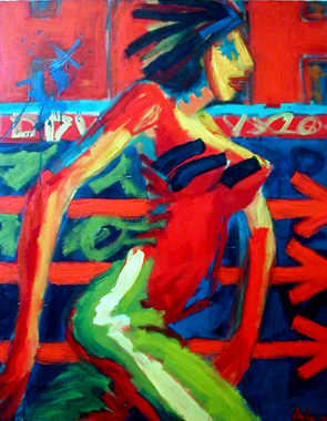 AKARSA BIO, SON PARCOURS : Tout en fr?quentant un atelier de peinture,Alexandre Akar a obtenu son dipl?me de plasticien de l’Ecole Nationale des Arts Appliqu?s (Paris XVe). Polyvalent, aimant les grands formats, il r?alise ?galement des murs peints, des fresques, des bas-reliefs, des objets en bois peints comme ces grands jeux de cubes, des totems, des grandes sculptures en assemblage de mat?riaux. On y voit sa volont? de concevoir son travail dans l’espace et le volume. ON ?UVRE : La peinture tr?s personnelle d’Alexandre Akar est essentiellement humaine, urbaine, sensible aux musiques actuelles. La vigueur du dessin, de la couleur, des coups de brosse montre sa fa?on de poser la question de l’image dans la peinture en suivant les exemples des expressionnistes allemands, de Matisse, de Picasso, du Pop-Art... Il utilise pour cela un m?dium acrylique qu’il charge en pigments choisis pour la puissance de leurs couleurs. |