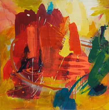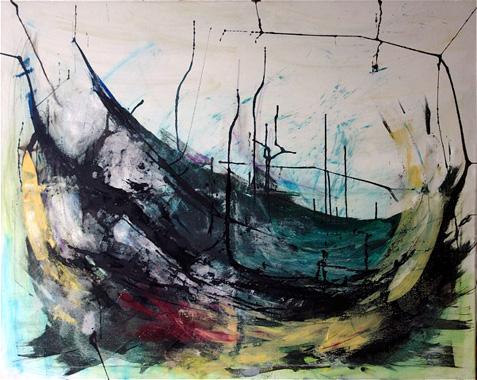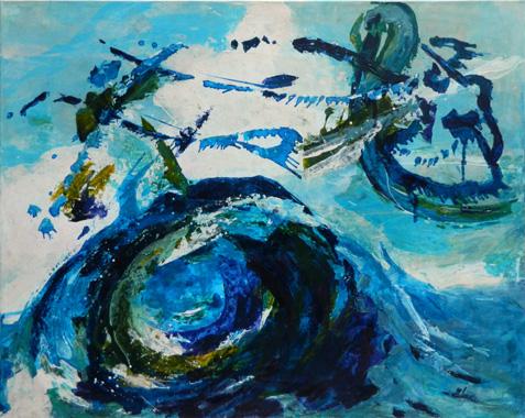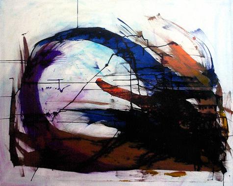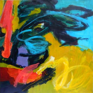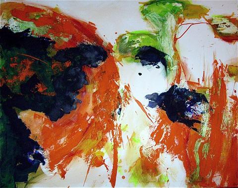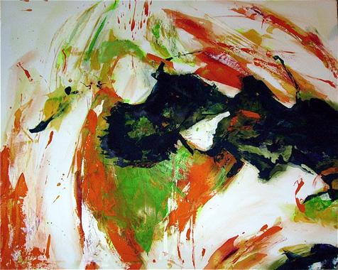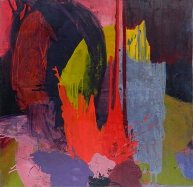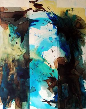 SON ?UVRE : Dans cette s?rie de peintures ? l’encre et acrylique, la technique se caract?rise par la fluidit? des masses color?es. Le dessin est une pratique r?guli?re pour l’artiste : les nus, pos?s ou en mouvement sont une de ses sources d’inspiration principales. Mais ce n’est qu’apr?s avoir emmagasin? suffisamment d’?nergie que l’artiste se lance dans la peinture. Elle implique alors tout son corps dans la cr?ation de ces compositions dynamiques, en mouvement. Cela commence par un ton, une couleur qui s’accorde avec un rythme int?rieur et s’incarne dans un geste plus ou moins vif mais toujours spontan?, instinctif. Prise dans l’?lan de la mati?re, la main ne s’arr?te que lorsque la forme surgit. Dans ce ballet incessant o? la spatule attire et chasse l’encre, le corps parle, seul? sans intention visible ou pr??tablie.