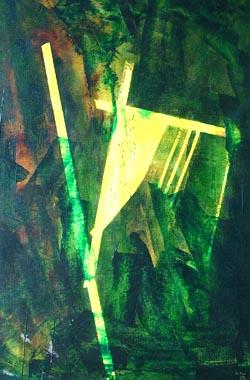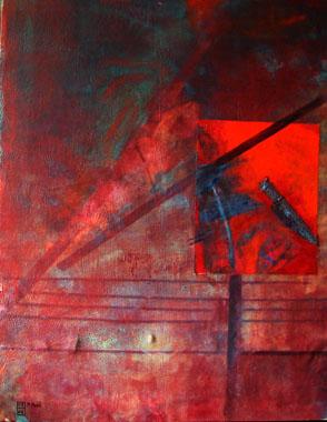 Sur ces supports se greffent des p?tes aux reliefs d’empreintes, des fragments de tissus, de photographies, d’imageries m?dicales,? Sable, ciment, pastel vont dynamiser l’?uvre maintes fois lav?e au brou de noix.